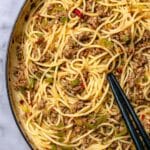 Keywords: angel hair pasta, Chinese beef sauce, ground beef pasta, quick pasta recipe, easy dinner, soy sauce beef pasta
