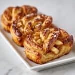 This Apple Puff Pastry recipe combines tender cinnamon-spiced apples and creamy sweetened cream cheese wrapped in flaky puff pastry. The braided presentation makes it perfect for breakfast, brunch, or dessert. Finished with an egg wash and a sprinkle of coarse sugar, it bakes to a beautiful golden brown with a crisp, buttery crust.