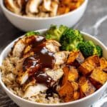 Keywords: BBQ chicken bowl, roasted sweet potato bowl, healthy dinner, meal prep bowl, gluten free BBQ recipe, grilled chicken recipe, sweet potato recipe, healthy bowl recipe, quick weeknight dinner
