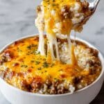 - Layer the Casserole: Grease a 9×13 inch baking dish with butter or cooking spray. Spread the creamy garlic butter rice evenly across the bottom. Layer the cooked ground beef on top of the rice, then sprinkle shredded cheddar cheese evenly over the beef. Finish with a layer of shredded mozzarella cheese for a perfect cheese pull.