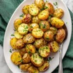 A white oval plate filled with roasted baby potatoes cut into halves, showing crispy golden brown skins and soft yellow inside. The potatoes are seasoned with green chopped herbs and small black pepper bits scattered on top. The plate sits on a white marbled surface with a green cloth napkin nearby, and a silver spoon partially visible on the right side. photo taken with an iphone --ar 4:5 --v 7