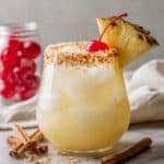 - Add Garnishes: Sprinkle freshly grated nutmeg over the top. Garnish by adding a pineapple slice and a maraschino cherry skewered on a cocktail pick, insert a straw, and serve immediately.