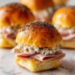 These Cheesy Turkey Sliders are a delicious and easy-to-make appetizer or snack, featuring Hawaiian sweet rolls layered with creamy mayo, tangy cranberry sauce, tender turkey slices, and melted mozzarella cheese. Topped with a flavorful garlic butter mixture and baked to golden perfection, these sliders are perfect for gatherings and holiday meals.