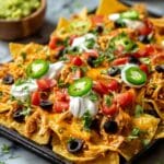 These Chicken Nachos are a crowd-pleasing appetizer or main dish featuring seasoned shredded chicken layered over thick-cut tortilla chips, topped with black beans, fresh vegetables, and a blend of melted cheddar and Monterey Jack cheeses. Baked to golden perfection and finished with cool sour cream, zesty guacamole, and fresh herbs, this recipe delivers a perfect balance of spicy, savory, and fresh flavors in just 25 minutes.