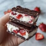 The image shows two pieces of a chocolate-covered dessert with three visible layers. The bottom layer is a smooth dark chocolate base with a shiny, slightly rough texture. In the middle, there is a thick white cream layer mixed with bright red chunks of fruit, likely strawberries, adding a soft and juicy look. The top layer is a thin, glossy dark chocolate coating with small textured bits on the edge, giving it a crunchy feel. The dessert is held by a woman's hand over a white marbled surface with some blurred pieces of red fruit in the background. Photo taken with an iphone --ar 4:5 --v 7