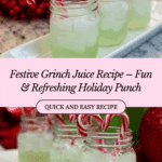 This festive Christmas Grinch Juice is a fun, refreshing, and lightly sweetened holiday punch perfect for holiday parties and gatherings. Inspired by the beloved story ‘How The Grinch Stole Christmas,’ this vibrant green punch combines citrus flavors with a hint of vanilla and almond extract, creating a delightful and visually striking drink that kids and adults will both enjoy. Served chilled with ice and garnished with candy canes or maraschino cherries, it’s a perfect addition to your Christmas celebrations.
