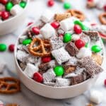 - Step 5: Sprinkle the M&M’s, mini Reese’s peanut butter cups, mini pretzels, mini marshmallows, and Christmas sprinkles (if using) over the cereal on the baking sheet. Gently stir to combine. Enjoy your festive Chex Mix!