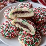 These Christmas Sprinkle Sugar Cookies with a surprise chocolate center inside are festive, delicious, and perfect for holiday gatherings. The cookies feature a tender almond-flavored sugar dough wrapped around a rich cocoa dough center, all rolled in colorful red, white, and green nonpareil sprinkles for a delightful crunch and holiday charm.
