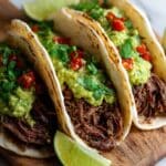 These Chuck Roast Tacos feature tender, slow-baked beef chuck roast seasoned with bold taco spices, then crisped to perfection and served on charred tortillas with fresh guacamole and salsa. An easy, flavorful recipe ideal for Taco Tuesday or any casual gathering.