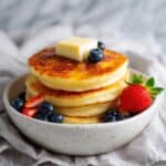 Three thick, round golden-brown pancakes with a crispy texture are stacked inside a white speckled bowl. On top of the middle pancake is a neat square of pale yellow butter beginning to melt. Around the pancakes, there are fresh blueberries with a deep blue color and one bright red strawberry with green leaves, adding a pop of color. The bowl sits on a light gray fabric with a white marbled background in soft focus. photo taken with an iphone --ar 4:5 --v 7