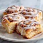 Four square pieces of cinnamon roll with visible layers of soft, light brown dough and dark cinnamon filling, topped with thick white icing drizzled evenly in stripes, sitting close together on a white plate. The plate rests on a white marbled surface. The cinnamon rolls look moist and fluffy with a slightly glossy finish from the icing. photo taken with an iphone --ar 4:5 --v 7