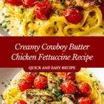 Cowboy Butter Chicken Pasta is a creamy, flavorful dish combining tender seasoned chicken thighs with fettuccine pasta, a rich butter-garlic sauce, and fresh cherry tomatoes. Enhanced with smoked paprika, cayenne, and parmesan, this hearty meal offers a perfect balance of smoky, spicy, and savory flavors, ideal for a comforting weeknight dinner.