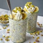 - Serve and Garnish: After chilling, divide the pudding evenly into three bowls or jars for easy grab-and-go portions. Top with crushed pistachios, sliced bananas (best added fresh on the day of serving), whipped cream, dark chocolate chips, or mixed berries as desired. Store any leftovers in an airtight container in the refrigerator for up to 5 days.