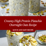 This Creamy High Protein Pistachio Pudding Overnight Oats recipe is a delicious and nutritious make-ahead breakfast combining rolled oats, Greek yogurt, pistachio pudding mix, chia seeds, and protein powder. It’s creamy, packed with protein, and topped with crunchy pistachios and fresh fruits, perfect for a quick and satisfying morning meal.