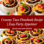 Creamy Taco Pinwheels are a fun and flavorful appetizer perfect for parties or casual gatherings. These bite-sized rolls combine seasoned meat, creamy cheese, and fresh veggies all wrapped in soft tortillas. Easy to prepare and sure to please a crowd!