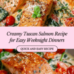 Creamy Tuscan Salmon is a rich and flavorful dish featuring pan-seared salmon fillets simmered in a luscious Tuscan cream sauce loaded with garlic, cherry tomatoes, spinach, parmesan, and fresh herbs. This elegant yet simple recipe pairs beautifully with pasta, potatoes, or greens for a satisfying and impressive meal.