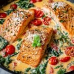 This Creamy Tuscan Salmon recipe brings together tender salmon fillets smothered in a rich, garlicky cream sauce with spinach, cherry tomatoes, and fresh basil. It’s an elegant yet easy dish perfect for a weeknight dinner or special occasion.
