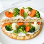 Two slices of vegetable flatbread are stacked on a white plate with a white marbled surface in the background. The base layer consists of light golden-brown flatbread with a soft and airy texture. On top is a creamy white spread covering the bread evenly. Bright orange carrot slices, small green broccoli florets, and off-white cauliflower pieces are arranged carefully over the spread, creating a fresh and colorful look. Small green herb leaves add a final touch of detail. The overall look is bright, fresh, and healthy. photo taken with an iphone --ar 4:5 --v 7
