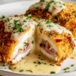 Deliciously Creamy Chicken Cordon Bleu is a classic Swiss-inspired dish featuring tender chicken breasts rolled with savory ham and Swiss cheese, coated in a crispy breadcrumb crust, and baked to perfection. Elevated with a luscious creamy sauce made from heavy cream, Dijon mustard, and Parmesan cheese, this recipe delivers a perfect balance of textures and rich flavors, ideal for both special occasions and comforting weekday dinners.