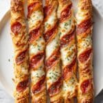 Festive Candy Cane Pizza Breadsticks offer a fun and delicious twist on classic pizza breadsticks, shaped like a candy cane and topped with savory pizza sauce, mozzarella cheese, and optional toppings such as beef pepperoni and diced red bell pepper. Perfect as a shareable appetizer or party snack during the holidays.