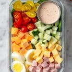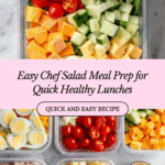A quick and easy chef salad meal prep recipe featuring chopped deli meats, cheeses, fresh vegetables, hard-boiled eggs, and a tangy homemade dressing. Perfect for healthy lunches prepared in advance, this salad combines crunchy romaine, savory meats, and a flavorful dressing that improves after resting overnight.