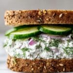 Keywords: cucumber salad sandwich, easy cucumber sandwich, healthy lunch, no-cook sandwich, Greek yogurt sandwich, low-fat sandwich, vegetarian sandwich