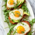 7. Serve: Transfer cooked French toast to a serving platter. Optionally top with arugula or spinach, sliced avocado, and fried or soft-boiled eggs for added flavor and texture.