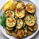 A white plate holds a circle of nine round zucchini slices, each topped with a golden-brown baked mixture showing small green herbs and a slightly crispy texture, arranged closely together. At the top left edge of the plate, half a bright yellow lemon is placed, cut side up. A small green dill sprig lies near the bottom left side of the plate, all set on a white marbled surface. photo taken with an iphone --ar 4:5 --v 7