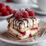 This Fresh Raspberry Tiramisu offers a delightful twist on the classic Italian dessert by incorporating juicy raspberries and a creamy mascarpone filling. Layers of coffee-soaked ladyfinger cookies are topped with mashed and whole raspberries, then enveloped in a light, fluffy mascarpone and whipped cream mixture. Chilled to perfection and dusted with cocoa powder, this no-bake dessert is elegant, refreshing, and ideal for any occasion.