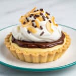A mini tart with a rough, golden brown crust forms the base. Inside, there is a smooth, light yellow cream layer topped by a thick, glossy dark chocolate layer spread evenly. On top of the chocolate layer, there is a big pile of soft, white whipped cream that looks fluffy. Sprinkled over the whipped cream are thin, toasted light brown coconut flakes and small, dark chocolate shavings. The tart sits on a white plate with a teal rim, all placed on a white marbled surface. Photo taken with an iphone --ar 4:5 --v 7