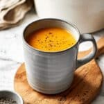 A grey ceramic mug filled with a smooth, bright orange soup topped with small black specks of pepper. The mug is placed on a round wooden cutting board with some scattered pepper pieces around it. In the background, a large white pot filled with the same orange soup is partially visible, along with a small grey bowl containing crushed pepper. The scene is set on a white marbled surface with a beige cloth folded near the top left corner. photo taken with an iphone --ar 4:5 --v 7