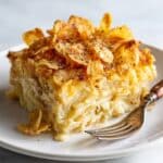 - Add Topping: Sprinkle the crushed cornflakes evenly over the surface of the casserole. Then drizzle the remaining melted butter (½ cup) on top of the cornflakes for a golden, crispy finish.