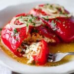 Keywords: Greek stuffed peppers, baked feta, roasted red peppers, Mediterranean appetizer, vegetarian Greek recipe