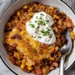 - Garnish and Serve: Remove from oven and garnish with chopped cilantro, your choice of salsa macha or hot sauce, and a dollop of sour cream or nonfat Greek yogurt. Serve warm and enjoy.