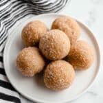 Seven round, light brown dough balls are placed closely together on a white plate. Each ball has a rough texture with coarse sugar crystals sprinkled evenly over the surface, giving them a sparkly, crunchy look. The plate is set on a white marbled surface with a black and white striped cloth visible in the background. The dough balls appear soft but firm, arranged in a simple cluster. photo taken with an iphone --ar 4:5 --v 7