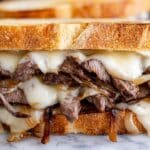 This Steak Sandwich recipe features tender, thinly sliced steak cooked to perfection, layered with caramelized onions and creamy Havarti cheese, all nestled in a buttered baguette. Enhanced with a homemade garlic dill herb butter and finished under the broiler for melty cheese, this sandwich offers a flavorful and satisfying meal perfect for lunch or dinner.