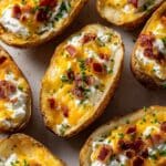 The image shows a close-up of several baked potato skins filled with melted cheddar cheese, sour cream, and small pieces of crispy bacon. Each potato skin acts as a golden-brown cup holding creamy white sour cream mixed with melted orange-yellow cheese. The tops are sprinkled with finely chopped green chives and tiny crispy brown bacon bits, adding color and texture contrast. The potato skins are placed close together, filling the frame, with a soft light that highlights the glossy melted cheese and the crispy edges. Photo taken with an iphone --ar 4:5 --v 7