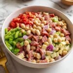 This Italian Grinder Bean Salad is a flavorful and hearty dish combining chickpeas, white kidney beans, sliced deli meats, provolone cheese, and fresh vegetables. Tossed in a tangy and savory homemade Italian dressing, it makes a perfect quick lunch or side dish, ready in just 15 minutes and packed with bold Mediterranean flavors.