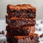 A stack of three thick, square chocolate brownies is shown. The top brownie has a cracked, shiny crust with a rich, dark brown color. Inside, the brownie looks moist and dense with melted chocolate chunks visible. The middle and bottom brownies have the same dense texture and deep brown color, with rough edges. The whole stack is placed on a white marbled surface, with some chocolate chips scattered around in soft focus. Photo taken with an iphone --ar 4:5 --v 7