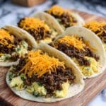 - Breakfast Burritos: hot breakfast sausage (1 lb), 10 eggs, green onion, seasonings (onion salt, sea salt, Everything but the Bagel, Everything but the Elote), cheddar cheese, low carb flour tortillas (10 soft taco-sized)