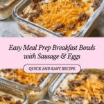 These meal prep breakfast bowls are a hearty, protein-packed way to start your day. With savory sausage, eggs, and cheese layered over crispy hash browns, they’re perfect for making ahead and enjoying throughout the week.