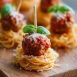 - Assemble the Appetizers: Place one meatball on top of each cooled pasta nest. Insert a toothpick into each meatball to secure it to the nest for easy serving.