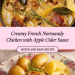 Normandy Chicken, also known as French Apple Cider Chicken, is a comforting dish that beautifully blends tender chicken with the sweet and tangy flavors of apple cider and cream. It’s a perfect meal to showcase the subtle sweetness of apples paired with savory herbs.