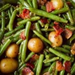Old Fashioned Green Beans with Bacon and Onion is a nostalgic, hearty side dish featuring fresh green beans cooked with crispy bacon, sautéed onions, and tender new potatoes. This rustic recipe brings the comforting flavors of a classic home-cooked meal, with the savory richness of bacon and the subtle depth from chicken bouillon seasoning, resulting in green beans just like grandma used to make.