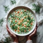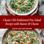 Old Fashioned Pea Salad is a classic creamy side dish that combines tender peas with a tangy mayonnaise and sour cream dressing, enriched with cheddar cheese, crispy bacon bits, and hard-boiled eggs. It’s a nostalgic and flavorful salad perfect for picnics, potlucks, or as a refreshing accompaniment to any meal.