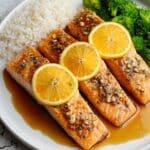 Store any leftover salmon in an airtight container in the refrigerator for up to 3 days. To reheat, warm gently in the microwave or oven to preserve the glaze and keep the fish moist.