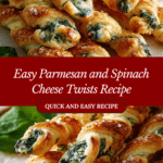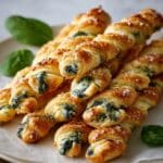 Parmesan and Spinach Cheese Twists are flaky, cheesy pastries featuring a crispy puff pastry exterior with a savory, flavorful spinach and cheese filling. These golden, twisted snacks are perfect for appetizers, parties, or a delicious snack with coffee or wine, offering a perfect balance between rich cheeses and fresh spinach with hints of garlic and nutmeg. Ready in under 30 minutes, they’re an impressive yet easy-to-make treat that can be enjoyed warm or at room temperature.