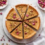 This Persian Love Cake is a fragrant and moist almond-based dessert infused with orange blossom water, cinnamon, and vanilla, topped with crunchy pistachios and delicate dried rose petals for an elegant finish. The cake features a crumbly almond crust and a creamy yogurt-based filling, baked to golden perfection and chilled to set for a luscious texture. Perfect for special occasions or a sophisticated treat.