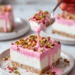 A square dessert with three visible layers sits on a white plate. The bottom layer is light beige and looks dense, the middle layer is white and creamy, and the top layer is bright pink with a smooth, glossy texture that drips down the sides. The dessert is topped with small green and pink pieces, likely crushed nuts or candy, scattered evenly across the pink layer. A woman's hand holding a gold spoon lifts a piece of the dessert, showing the creamy white inside. The background is a white marbled surface. photo taken with an iphone --ar 4:5 --v 7