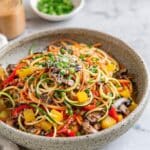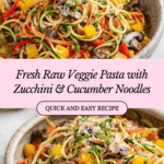 This raw spaghetti and vegetable pasta is a vibrant, fresh dish ready in just 15 minutes. Using spiralized zucchini and cucumber as noodles, it’s a light and healthy alternative to traditional pasta that’s perfect for warm days or when you want something quick and nourishing.